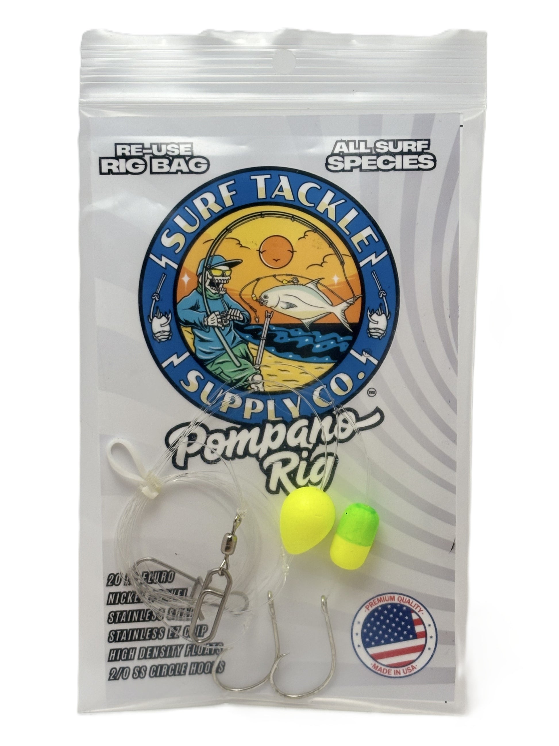 For green and chartreuse pompano rigs in Florida, the ideal water color is generally a light blue or green hue, with a little bit of stirred sediment. This clarity allows fish to see the rig while still providing enough cover for them to be attracted to the bright colors. It's not too clear, nor is it muddy Each STS Co. surf rig is constructed with high-quality American-made components. The precisely engineered drop loop placement guarantees the bait is presented effectively within the water column. Packaged in a reusable, leader wallet-grade bag, the rig includes a stainless steel speed link for rapid rig changes.