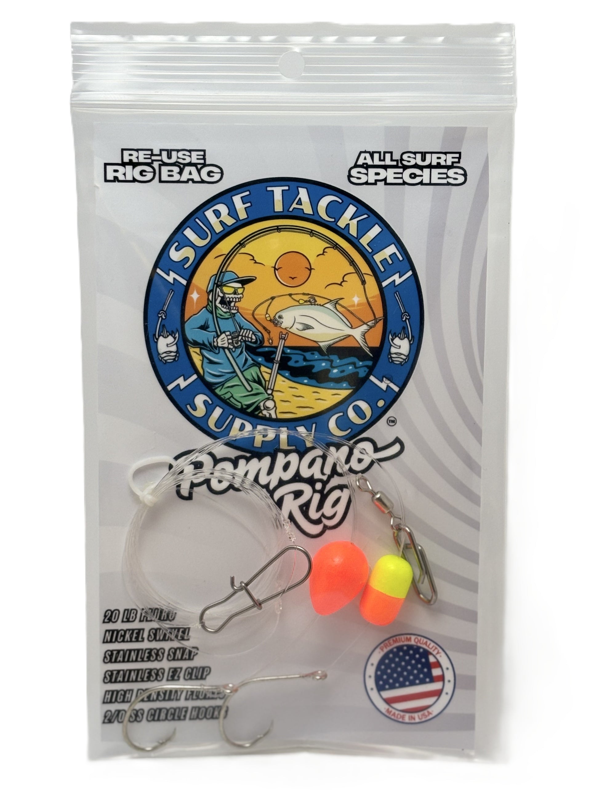 For pompano fishing in Florida, chartreuse and orange are generally effective colors, especially in slightly stained or hazy water. Each STS Co. surf rig is constructed with high-quality American-made components. The precisely engineered drop loop placement guarantees the bait is presented effectively within the water column. Packaged in a reusable, leader wallet-grade bag, the rig includes a stainless steel speed link for rapid rig changes.